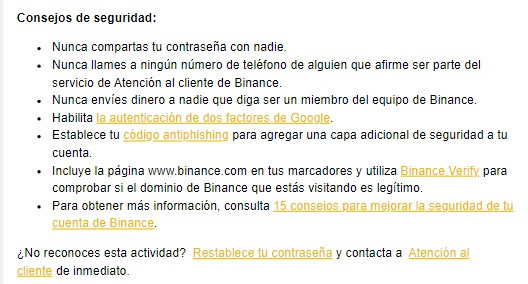 En el siguiente cuadro podrás ver consejos de seguridad de la plataforma Binance: